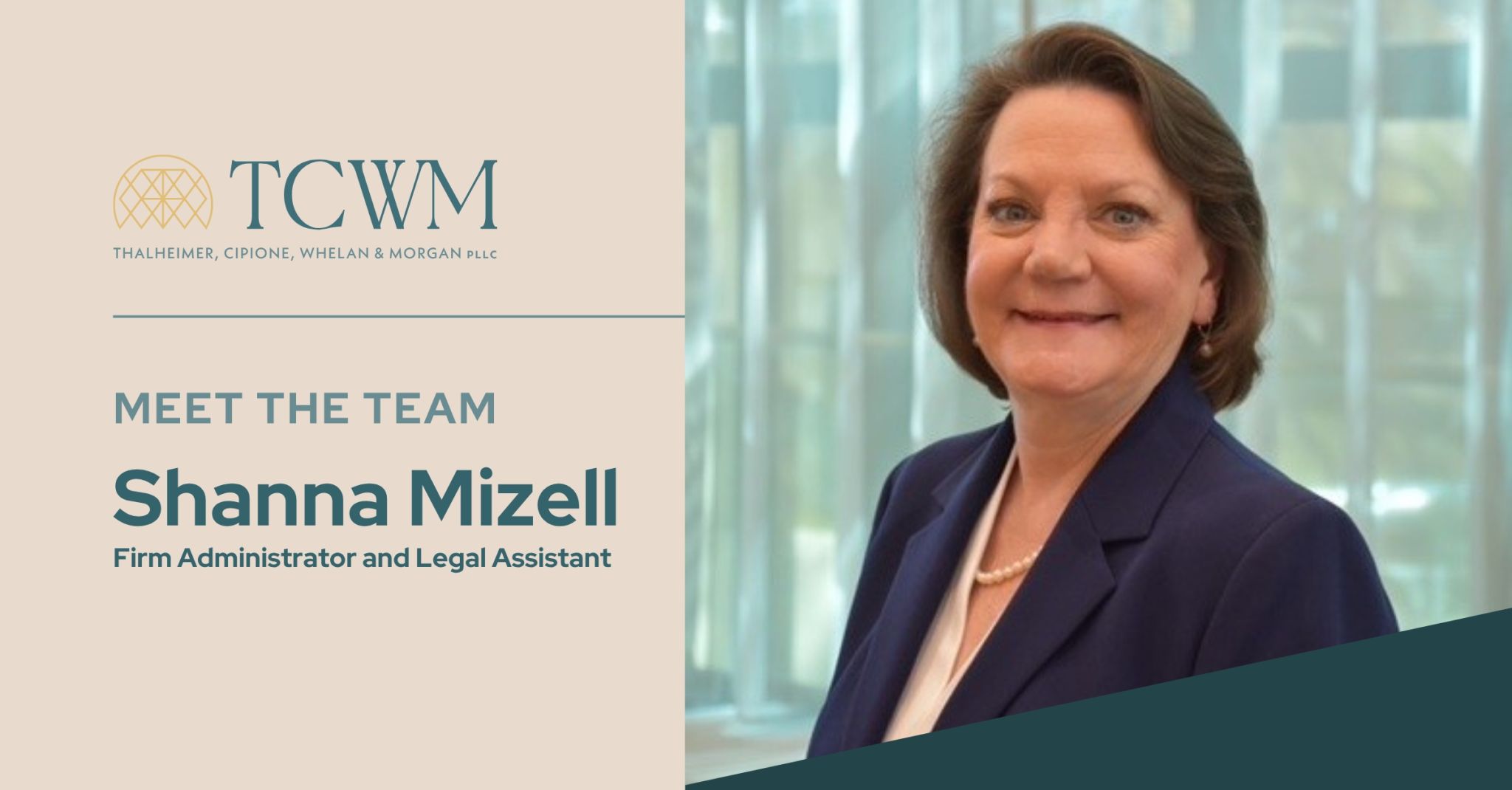 Meet Shanna Mizell Firm Administrator & Legal Assistant at Thalheimer, Cipione, Whelan & Morgan PLLC. With a sharp eye for detail and a talent for keeping operations running smoothly, Shanna...